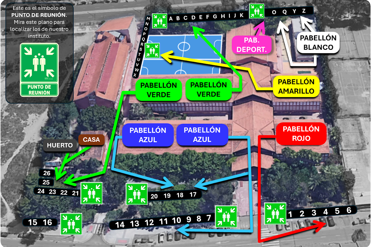 En la foto podemos apreciar una imagen aérea de nuestro centro, con todas las vías de evacuación y los puntos de reunión a donde cada grupo se ha dirigido hoy al sonar la señal de alarma.